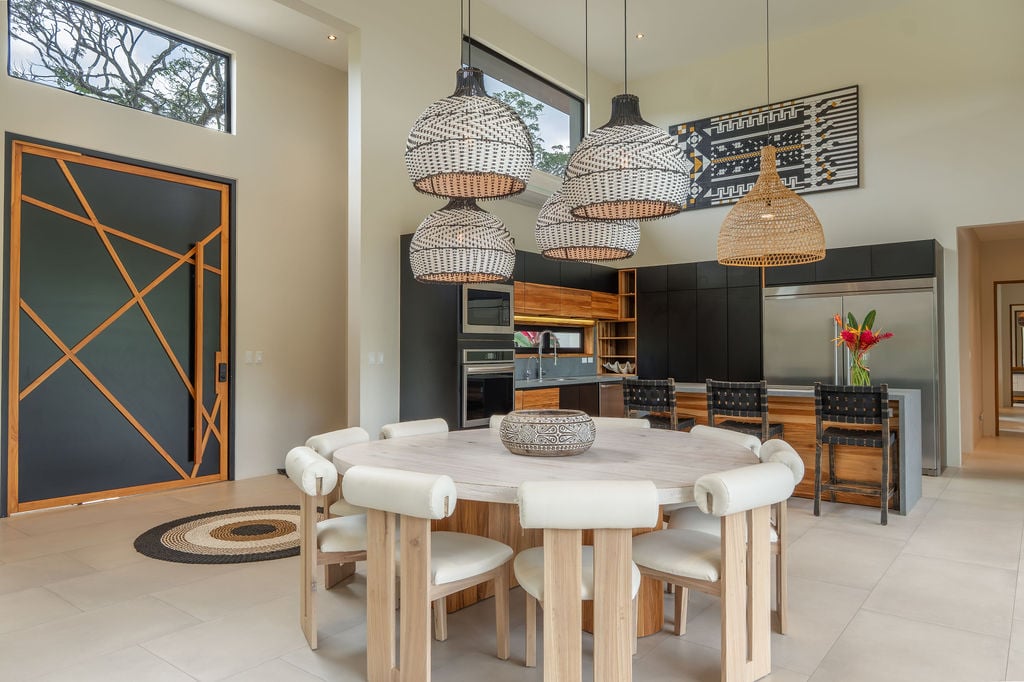 From the moment you arrive, a majestic Guanacaste tree and manicured tropical landscaping welcome you home. Inside, a grand pivot door opens to an airy, light-filled living space with floor-to-ceiling sliding glass doors that open completely to the pool and garden.