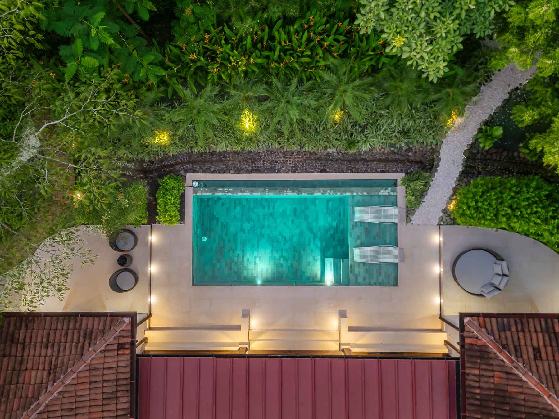 A private pool surrounded by lush landscaping, shaded terraces, and lounge areas designed for entertaining or unwinding in paradise.